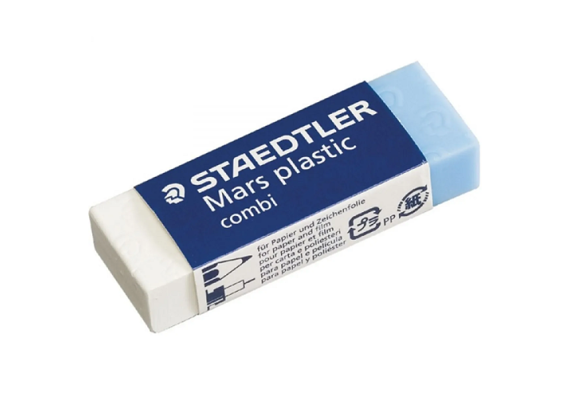 A Mars Plastic Combi foi feita para múltiplos usos, e tem o corpo com duas composições diferentes: uma mais macia, na cor branca, para apagar grafite, e outra mais firme, na cor azul, que é ideal para apagar tinta nankim em papel vegetal.