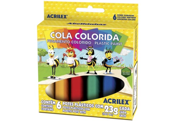 Especificações Possui bico aplicador Material não tóxico Cores com brilho intenso.Ideal para Colagens Relevos coloridos decorações em geral Pintar sobre todos os tipos de papelEmbalagem Contém 6 cores 23gr cada.